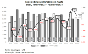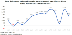 Na análise dos dados dos dois primeiros meses de 2024, verifica-se uma abertura de 1.074 postos de trabalho. “O resultado positivo no bimestre é explicado por conta da convocação de aprovados em concurso do Banco do Brasil”, alertou o economista Gustavo Cavarzan, do Dieese. “Basta ver que a ampliação de vagas no período está associada, particularmente, à criação de vagas de ‘escriturário’. Se desconsiderarmos esta movimentação extraordinária, o saldo seria de 543 postos de trabalho a menos neste período”, explicou.