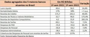 Nos seis primeiros meses de 2022, os cinco maiores bancos do país (Caixa, Banco do Brasil, Bradesco, Itaú e Santander) arrecadaram R$ 74,2 bilhões com tarifas cobradas dos seus clientes, alta de 7,5% em relação ao mesmo período de 2021.