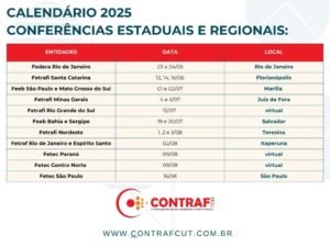 Necessárias para a organização e fortalecimento do movimento sindical da categoria bancária, as conferências regionais e estaduais já estão em curso. A primeira organização a iniciar a atividade foi a Federação das Trabalhadoras e dos Trabalhadores no Ramo Financeiro do Estado do Rio de Janeiro (Federa-RJ), que realizou sua conferência entre 23 e 24 de maio. Veja, no calendário a seguir, as próximas datas marcadas pelas outras 10 entidades que o Comando Nacional dos Bancários representa nas negociações com os bancos.
