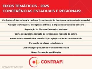 “As conferências regionais e estaduais fazem parte de um conjunto de ações para garantir a representatividade da categoria nas mesas de negociação com os bancos e que culminam na Conferência Nacional. A Consulta Nacional dos Bancários, que realizamos todos os anos, por exemplo, faz parte dessas ações. Em todas essas instâncias nós vamos construindo as pautas que são fundamentais na luta da categoria bancária pela manutenção dos direitos conquistados há três décadas na CCT e para avançarmos em novos direitos”, pontua Juvandia.
