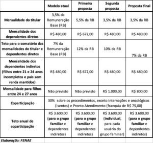 Resposta: A proposta não prevê qualquer aumento nas mensalidades do titular, dependentes diretos ou indiretos ou no teto de cobrança das mensalidades. Também não prevê aumento nos valores de coparticipação.