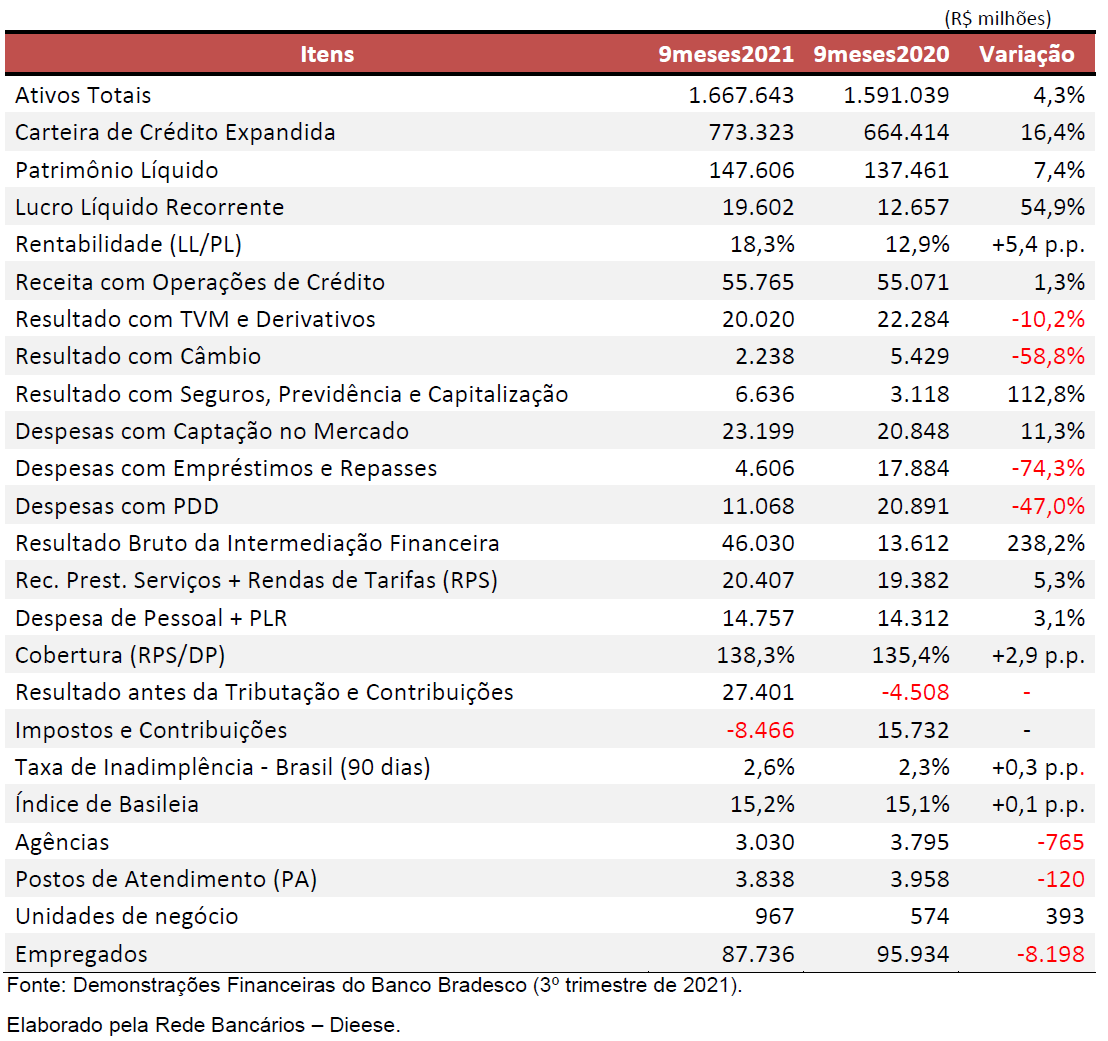 O banco Bradesco obteve lucro líquido recorrente de R$ 19,602 bilhões nos nove primeiros meses de 2021, crescimento de 54,9% em relação ao mesmo período de 2020. No 3º trimestre, o lucro foi de R$ 6,767 bilhões, alta de 7,1% em relação ao trimestre imediatamente anterior. A rentabilidade (retorno sobre o Patrimônio Líquido médio anualizado do banco –ROE) foi de 18,3%, com alta de 5,4 pontos percentuais (p.p.) em doze meses.