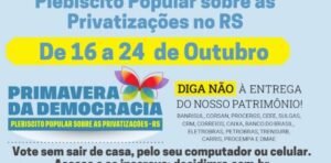 A primavera da democracia está começando. Após um período de debates e organização de comitês municipais e regionais, terá início neste sábado, 16/10, a votação do Plebiscito Popular sobre as Privatizações no Rio Grande do Sul. Cada gaúcho e gaúcha poderá se manifestar em cédulas e depositar o seu voto em urnas coletoras ou então se cadastrar e votar pela internet. O prazo vai até o próximo dia 24. Veja o link aqui abaixo: