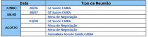 A Caixa apresentou uma proposta calendário de negociações que prevê mais duas reuniões do GT Saúde Caixa, três mesas de negociações com a CEE e a assinatura do acordo específico até o fim de agosto (veja abaixo a proposta de calendário feita pela Caixa).
