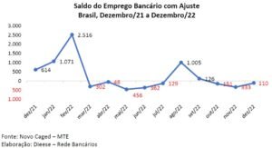 A trajetória do emprego formal no setor bancário apresentou oscilação durante todo o ano de 2022, segundo levantamento realizado pelo Departamento Intersindical de Estatística e Estudos Socioeconômicos (Dieese), com base no Novo Cadastro Geral de Empregados e Desempregados (Caged). Apenas nos meses de janeiro, fevereiro, agosto e setembro a soma das contratações foi maior do que a das demissões. Nos demais meses, o saldo foi negativo. Mas, no cômputo geral do ano, houve mais contratações do que demissões, gerando um saldo positivo de 4.716 postos de trabalho.