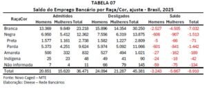 O setor bancário segue reduzindo postos de trabalho, como mostra a Pesquisa do Emprego Bancário nº38, mais recente análise do Departamento Intersindical de Estatísticas e Estudos Socioeconômicos (Dieese) sobre os dados do Cadastro Geral de Empregados e Desempregados (CAGED), de 2025, divulgado pelo Ministério do Trabalho e Emprego.